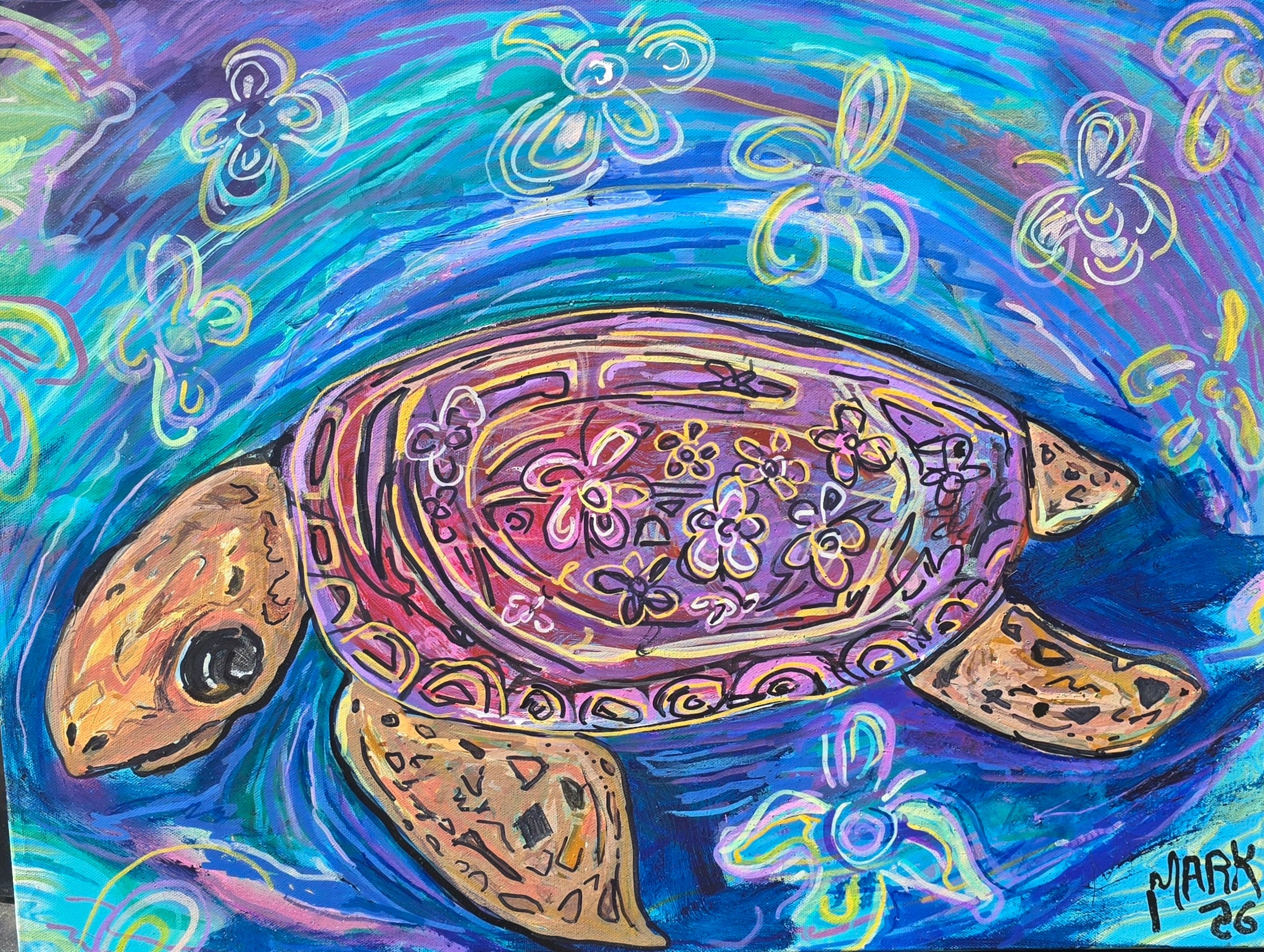 Dive into the serene beauty of the ocean with this stunning sea turtle original painting. Measuring 24" x 16", this canvas captures the graceful majesty of these ancient mariners in their natural habitat, rendered with the artistic vision of Mark Dannon Herbert. Each brushstroke brings the underwater world to life, inviting you to experience the tranquility and wonder of aquatic life. Whether you're drawn to marine conservation, ocean aesthetics, or simply seeking a conversation-starting centerpiece, this original artwork transforms any space into a coastal sanctuary. Own a piece of the sea. Limited edition prints coming soon for those seeking to expand their collection.